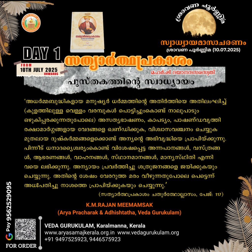 സത്യാർത്ഥപ്രകാശം സ്വാധ്യായം – ഒന്നാം ദിനം (ശ്രാവണ പൂർണ്ണിമ – 10.07.2025)